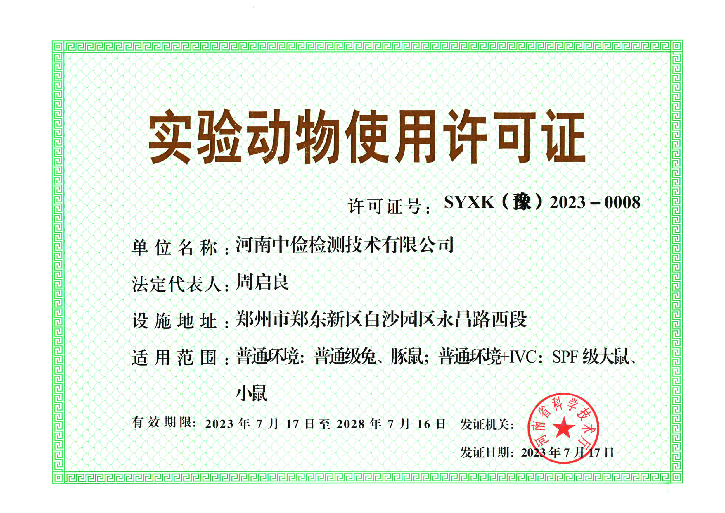• 喜報!河南中儉檢測取得新的實驗動物使用許可證!